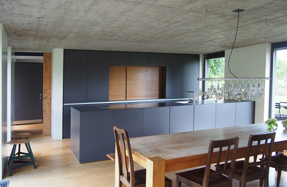 Konstruiert in Mischbauweise (Erdgeschoss Stahlbeton mit Außendämmung und Sichtbetondecke, Obergeschoss Holzrahmenbau mit horizontaler Leistenschalung) reagiert die einfache Gesamtstruktur auf die Vorgaben nach kostengünstigem Bauen mit hohem Eigenleistungsanteil.